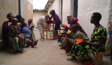 Notons en particulier la remise des couches à tout les membres de la coopérative (même celles qui n’ont pas d’enfant, qui en ont demandé pour leurs petits enfants, pour les enfants des soeurs, etc…), ainsi qu’à d’autres mamans qui nous ont rendu visite avec leurs enfants au cour de notre séjour. Sur cette photo, Marie et Fernande sont en train d’habiller un bébé qui vient de faire pipi sur la jupe de Marie. Pour les mamans que nous avons rencontrées, que le bébé fasse pipi dans ses vêtements ou même fesses nues est une chose normale. Grande maman, Fernande leur a expliqué que le nez des bébés qui coule, c’est aussi le froid dû au fait qu’ils restent dans les habits mouillés.