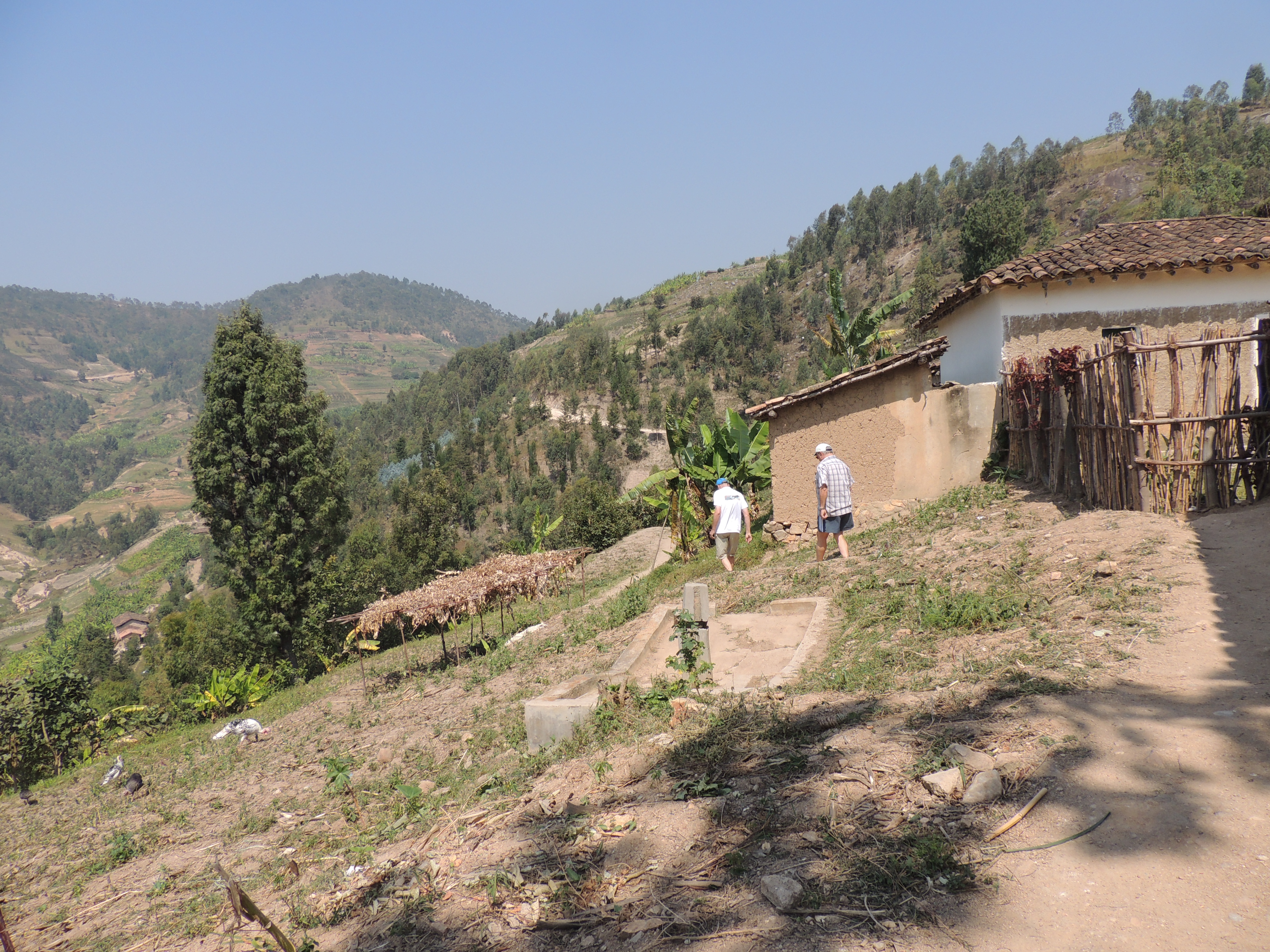« L’environnement est superbe, nous sommes sur une petite crête proche de l’école de Gitarama. Les montagnes sont parsemées d’habitations et de cultures diverses. Bananeraies, champs de patates douces, de maniocs, ananas, quelques caféiers, goyaves, avocatiers, etc… Nous découvrons une faune et flore, inconnue dans nos régions, idéal pour les chasseurs de photos (Ronny et Annie)