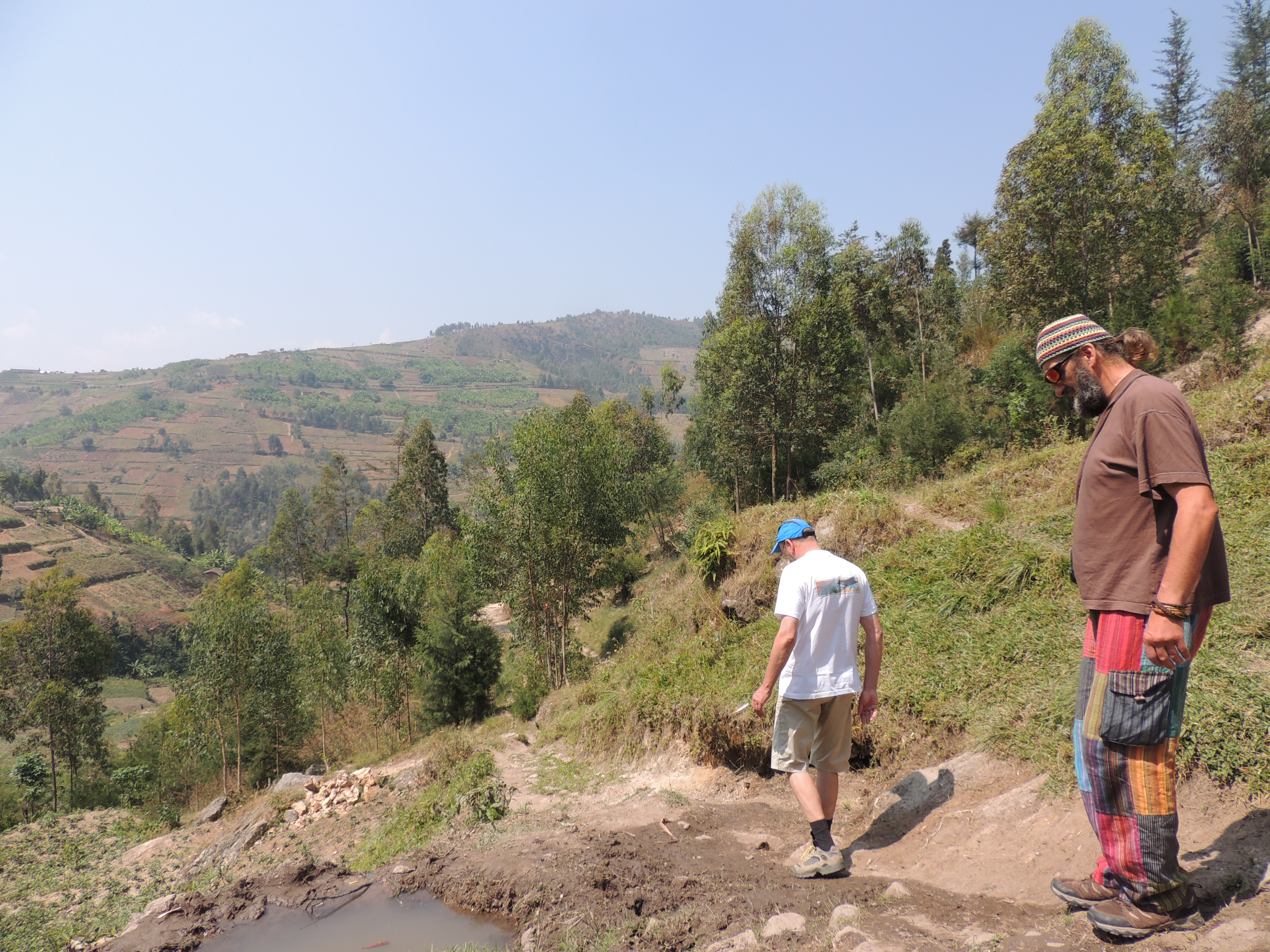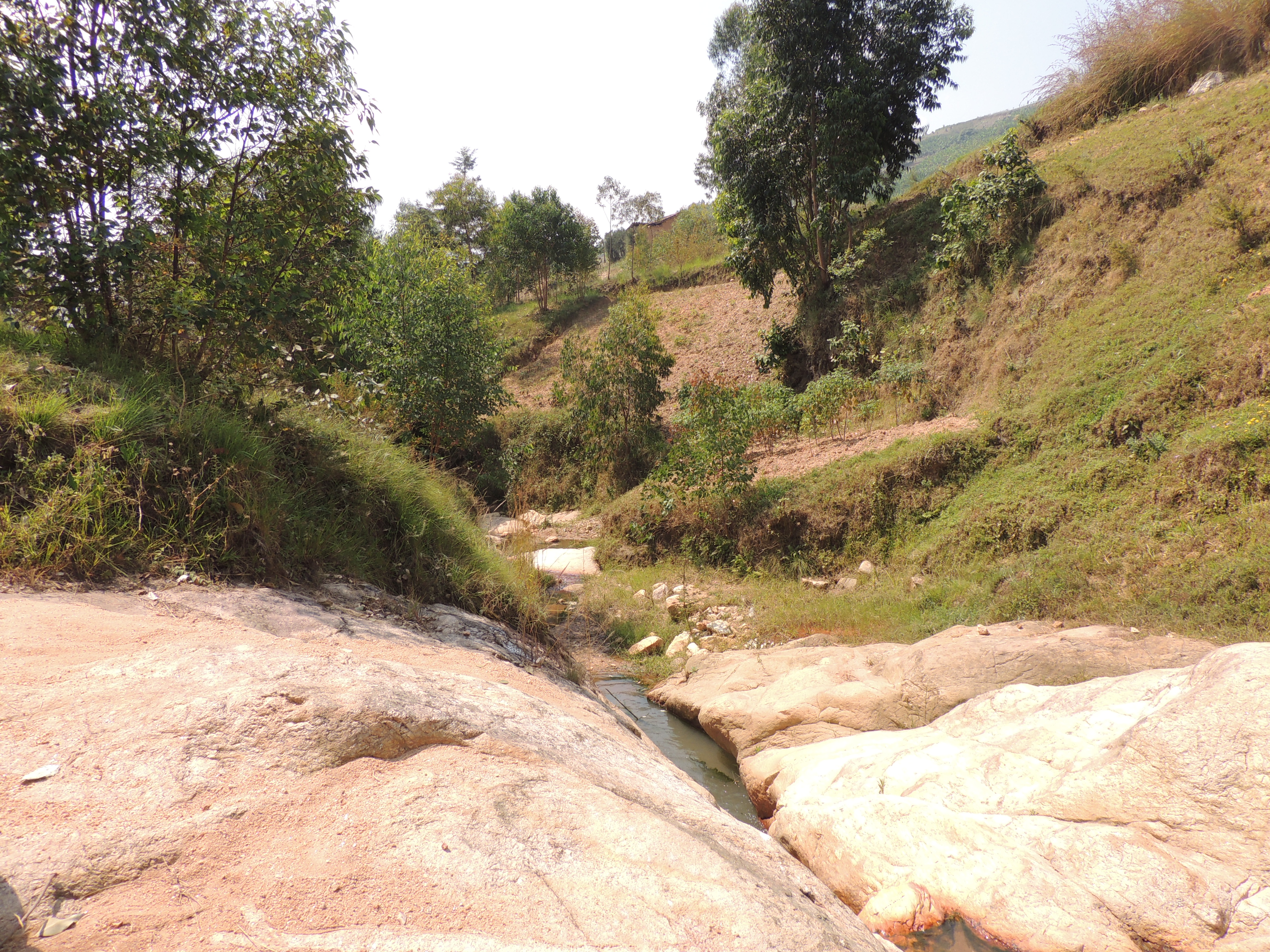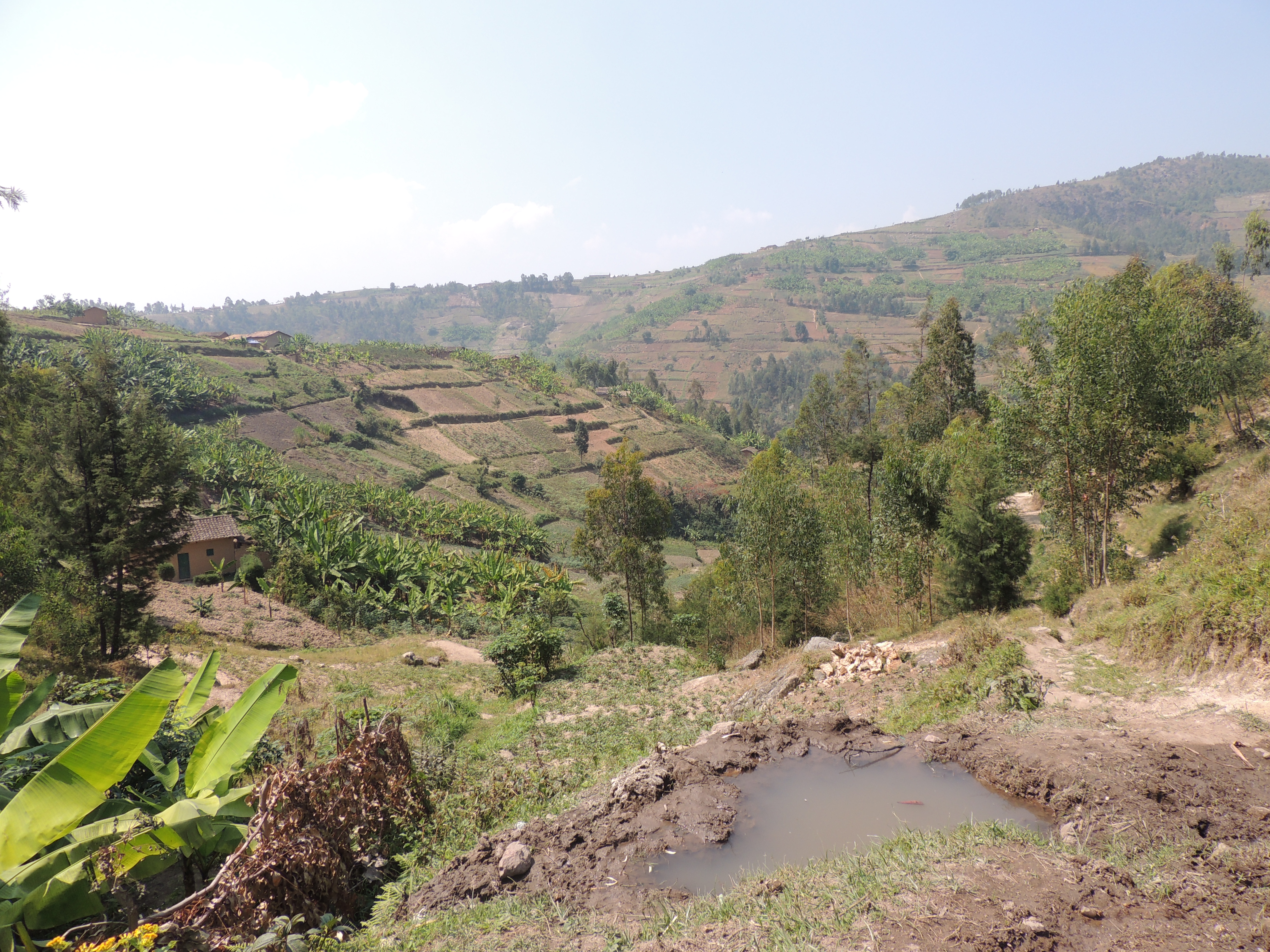 Nous faisons une petite promenade vers la rivière Gisuma, au fond de la vallée, en passant par la borne-fontaine. Des enfants attendent patiemment que le filet d’eau remplisse les bidons d’eau ».