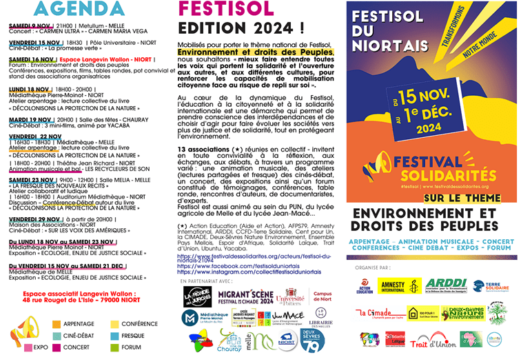 Le programme du festisol du Niortais – 2024 par Centre Ubuntu10/11/2024Laisser un commentaire Partager :Partager Cliquez pour partager sur Facebook(ouvre dans une nouvelle fenêtre) Facebook Cliquer pour partager sur X(ouvre dans une nouvelle fenêtre) X Cliquer pour envoyer un lien par e-mail à un ami(ouvre dans une nouvelle fenêtre) E-mail J’aime chargement…