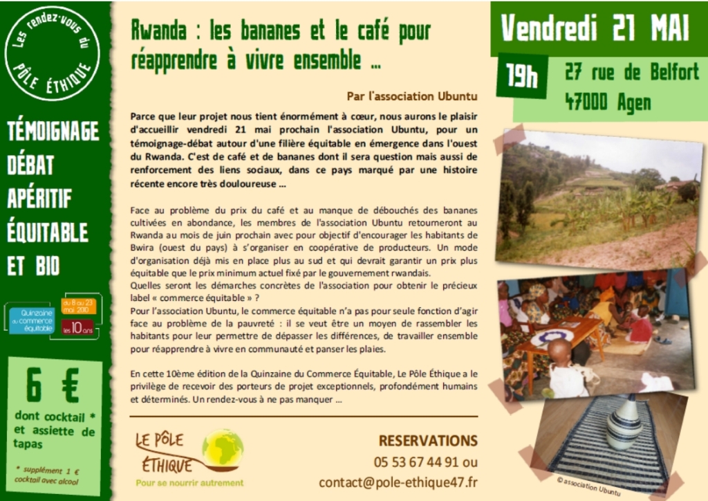 Témoignage-débat-apéritif équitable et bio organisé par Pôle Ethique à Agen, dans le cadre de la quinzaine du commerce équitable. Voir le dépliant ici.